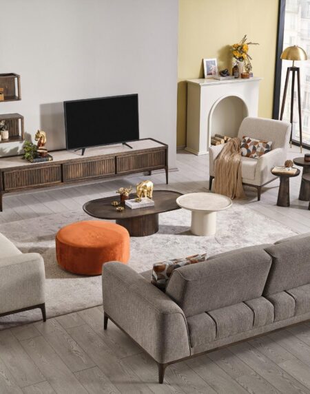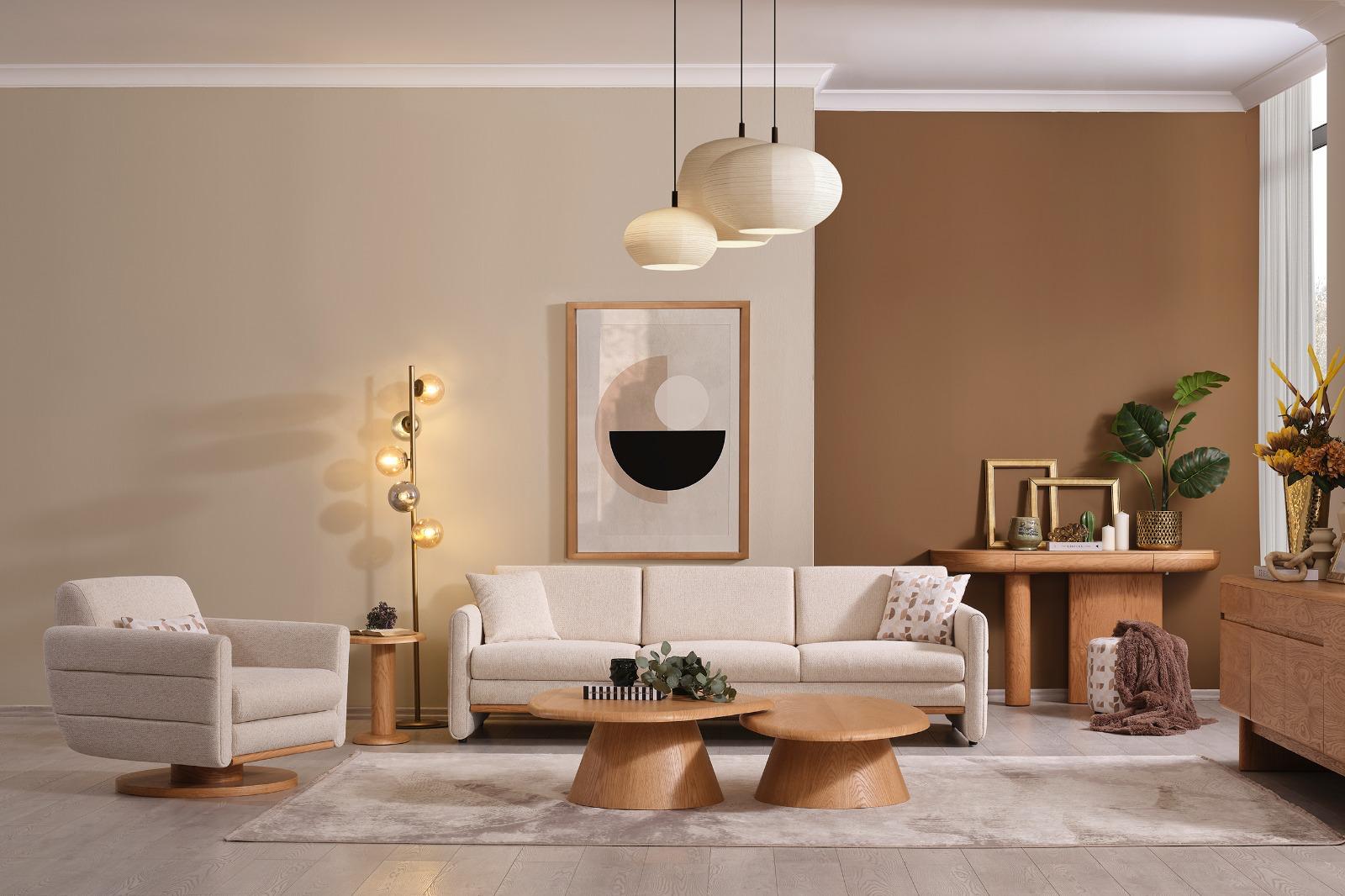 Modern tasarımın doğallıkla harmanlandığı Boldy Koltuk Takımı, yuvarlak hatları, sıcak bej tonları ve döner ayak detaylarıyla hem estetik hem de konfor sunuyor. Ahşap dokuların öne çıktığı bu takım, yalın ama etkileyici bir atmosfer yaratmak isteyenler için ideal bir tercih.