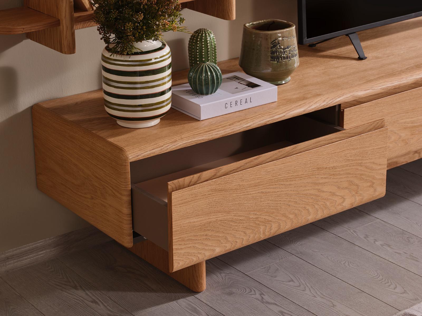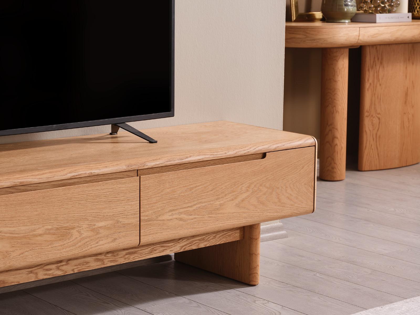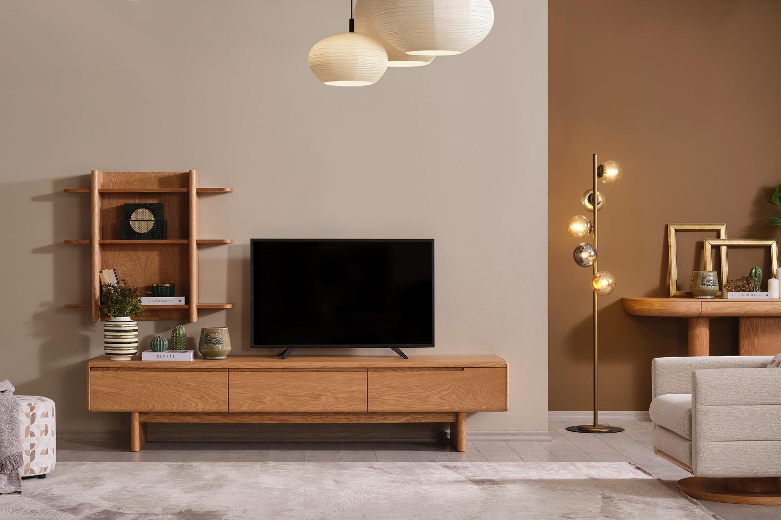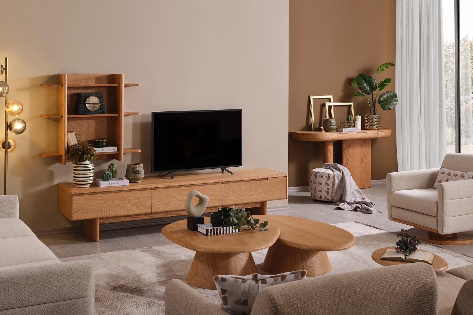 Boldy TV Ünitesi, güçlü meşe dokusunu yuvarlatılmış hatlarla buluşturarak sadeliğin içindeki estetiği ön plana çıkarıyor. Gövdeye gömülü kulp detayları, tasarımı sadeleştirirken kullanım kolaylığı sağlıyor. Organik çizgilerle şekillenen masa ve sehpalarla bütünleşen ünitenin yumuşak geçişleri, mekânda doğal bir akış yaratıyor. Boldy, modern dekorasyon anlayışına doğallık ve sıcaklık katmak isteyenler için ideal bir seçim.