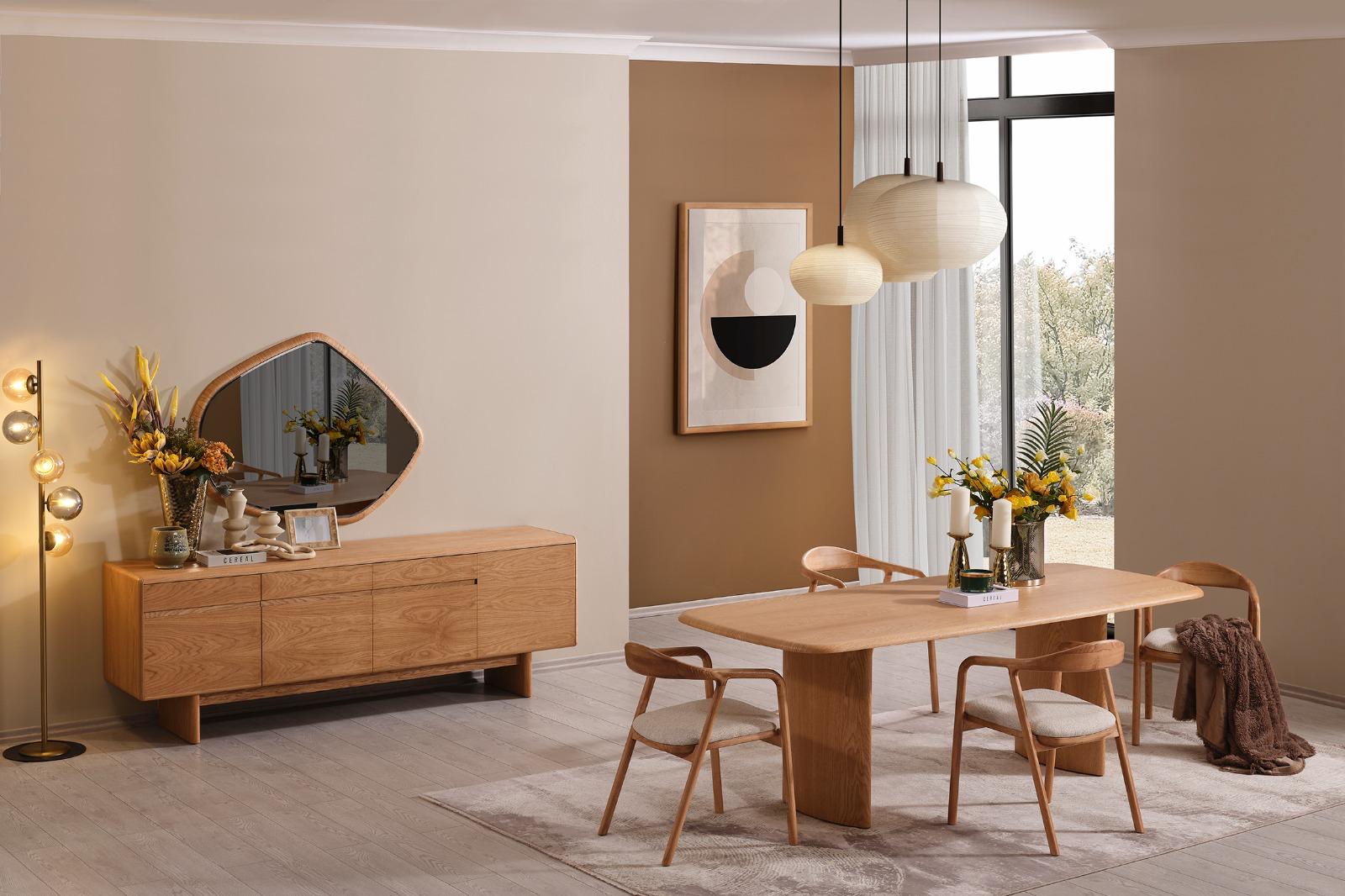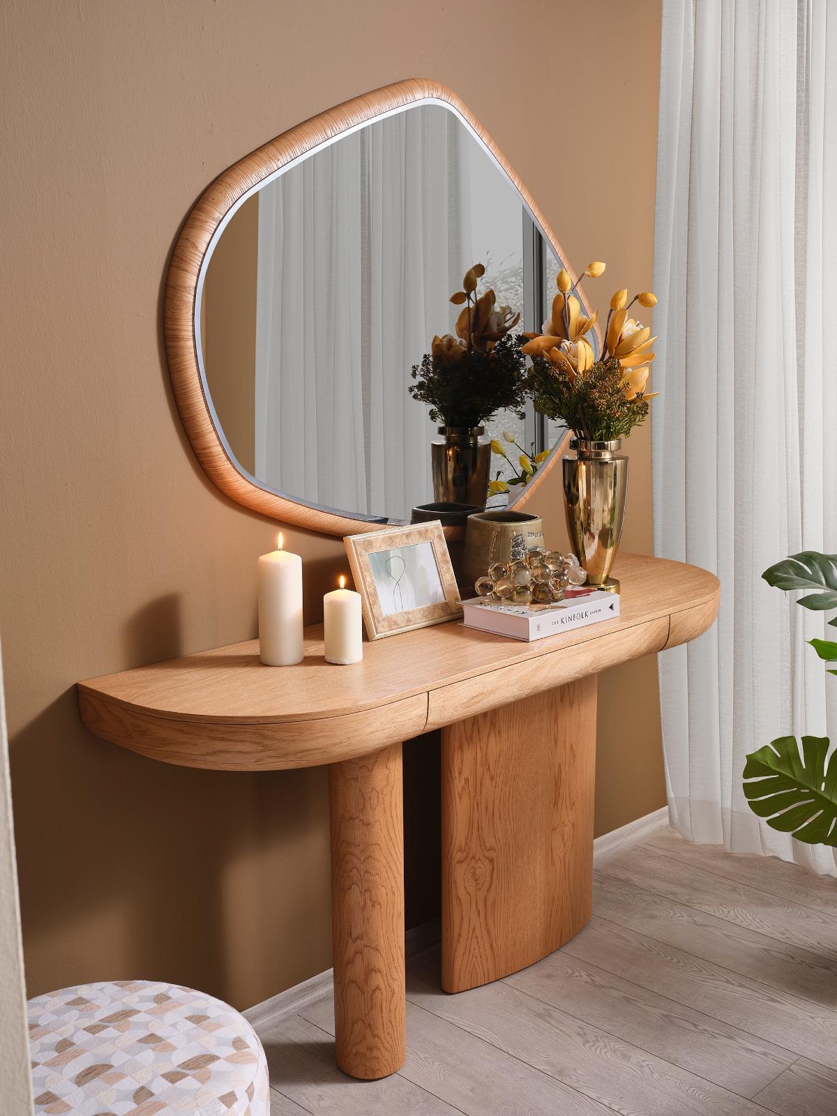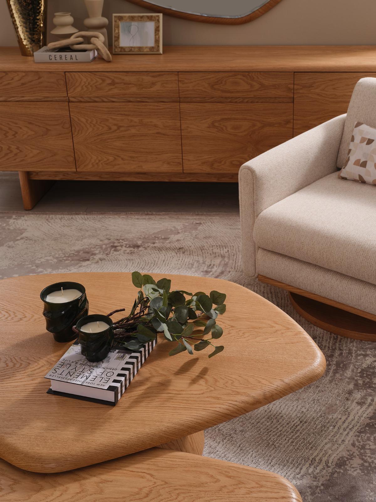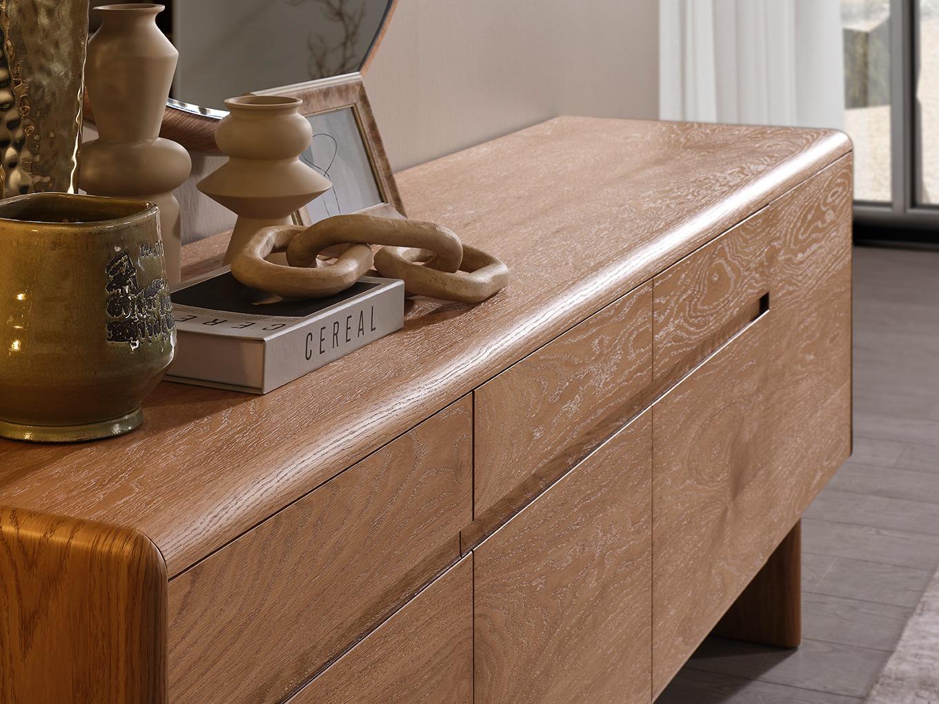 Boldy TV Ünitesi, güçlü meşe dokusunu yuvarlatılmış hatlarla buluşturarak sadeliğin içindeki estetiği ön plana çıkarıyor. Gövdeye gömülü kulp detayları, tasarımı sadeleştirirken kullanım kolaylığı sağlıyor. Organik çizgilerle şekillenen masa ve sehpalarla bütünleşen ünitenin yumuşak geçişleri, mekânda doğal bir akış yaratıyor. Boldy, modern dekorasyon anlayışına doğallık ve sıcaklık katmak isteyenler için ideal bir seçim.