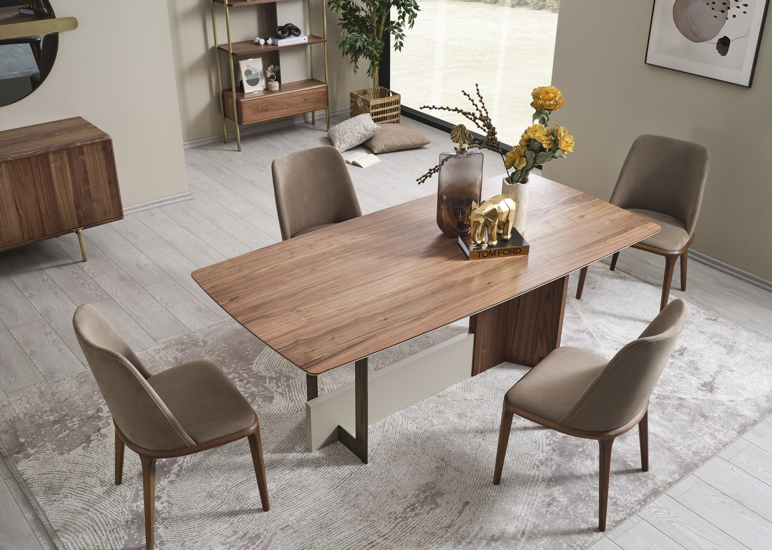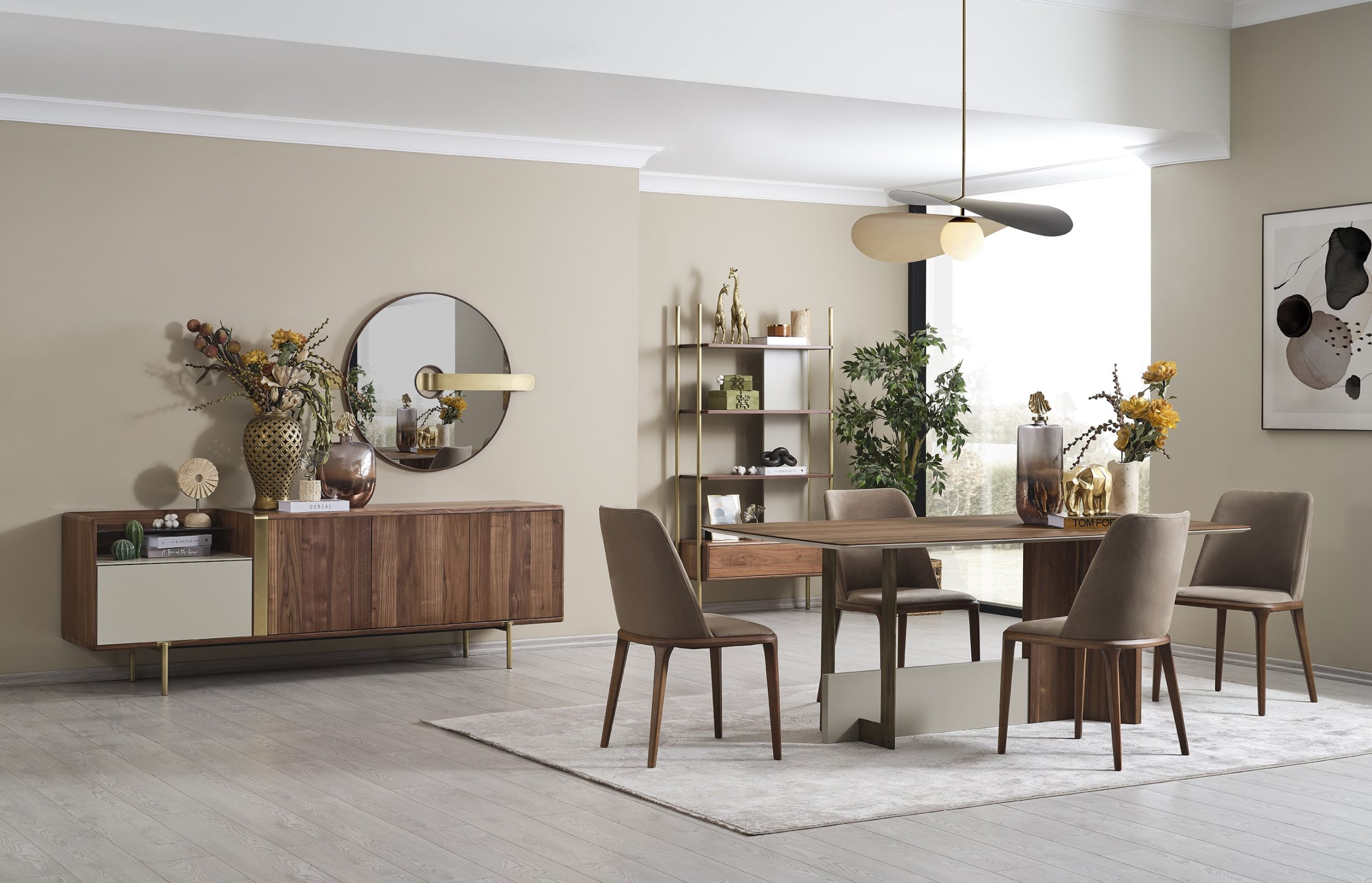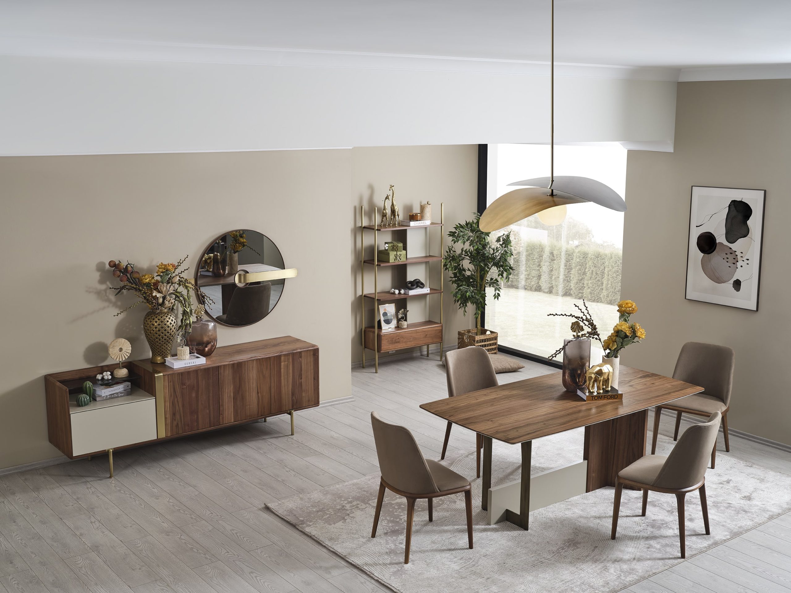 Dalvia Yemek Odası, zarif ceviz desenleri ve altın rengi detaylarıyla sıcaklık ve sofistikeliği bir arada sunuyor. Özgün ayak tasarımıyla öne çıkan masa, fonksiyonelliğin yanı sıra dekoratif bir değer de taşıyor. Konsol, raf ve ayna gibi tamamlayıcı parçalar, mekânda bütünlük yaratırken; sade çizgileriyle çağdaş iç mekanlara kusursuz bir uyum sağlıyor. Dalvia, sadece yemek yemek için değil, paylaşımın ve estetiğin buluştuğu bir atmosfer yaratmak için tasarlandı.