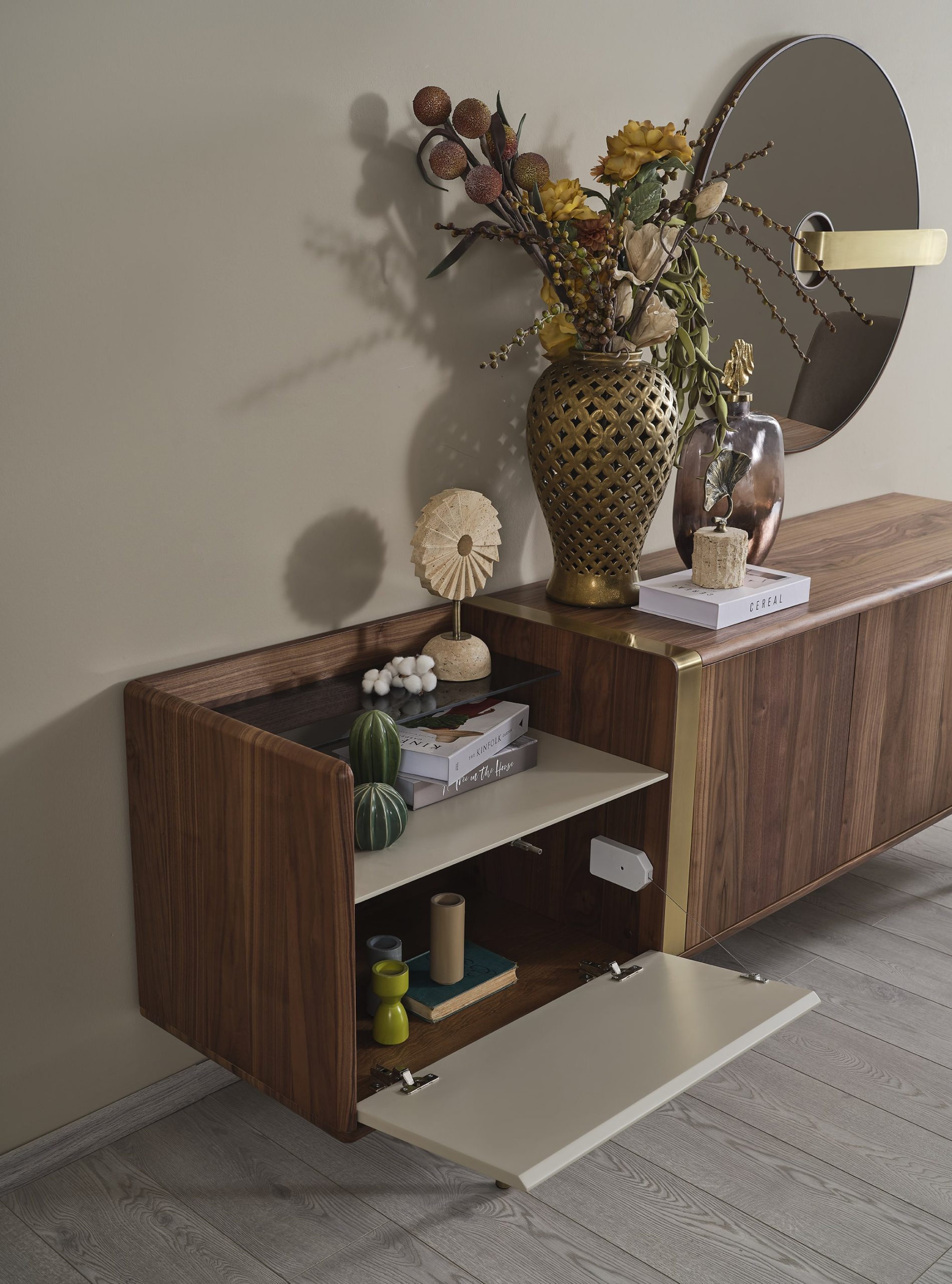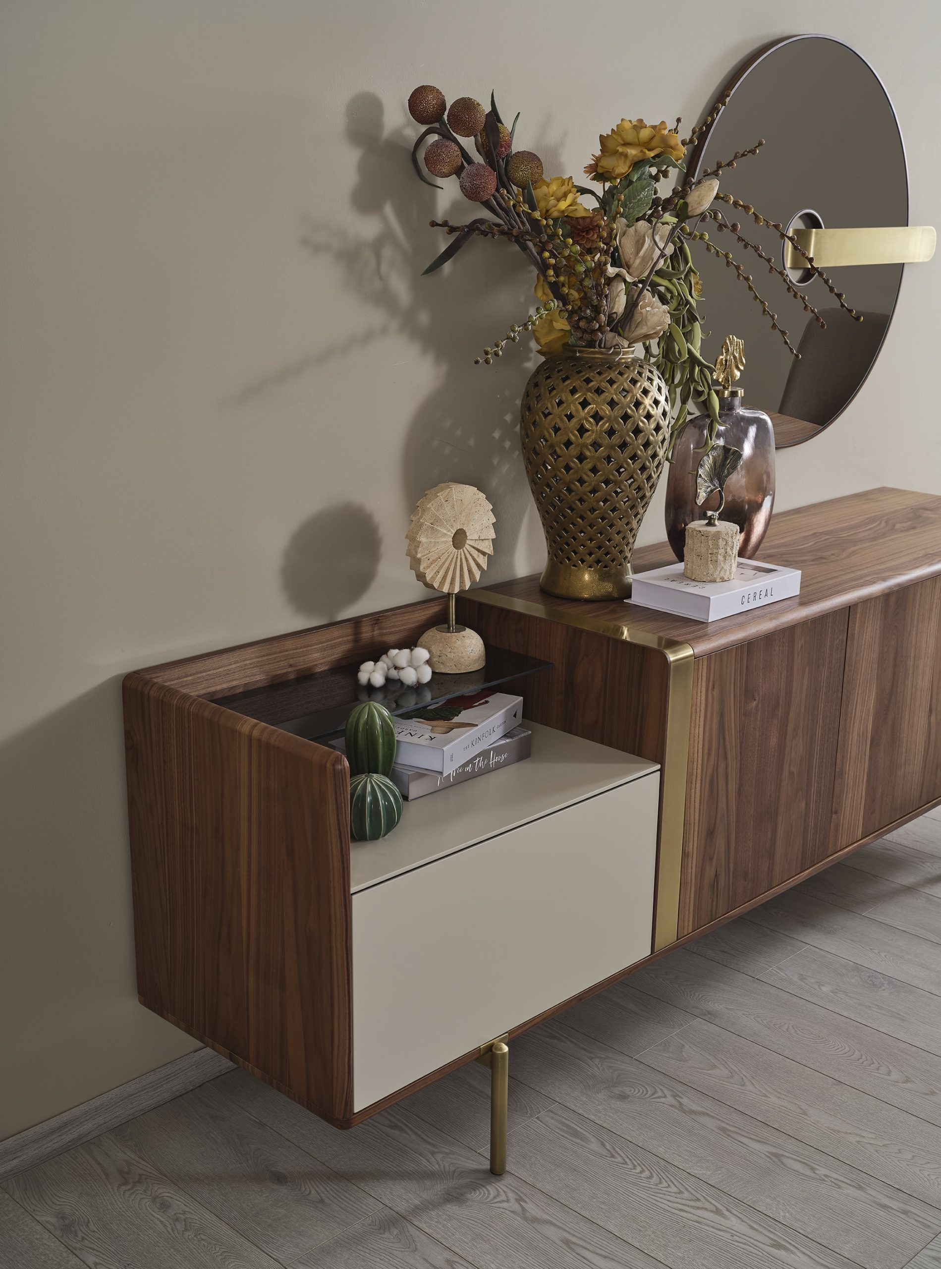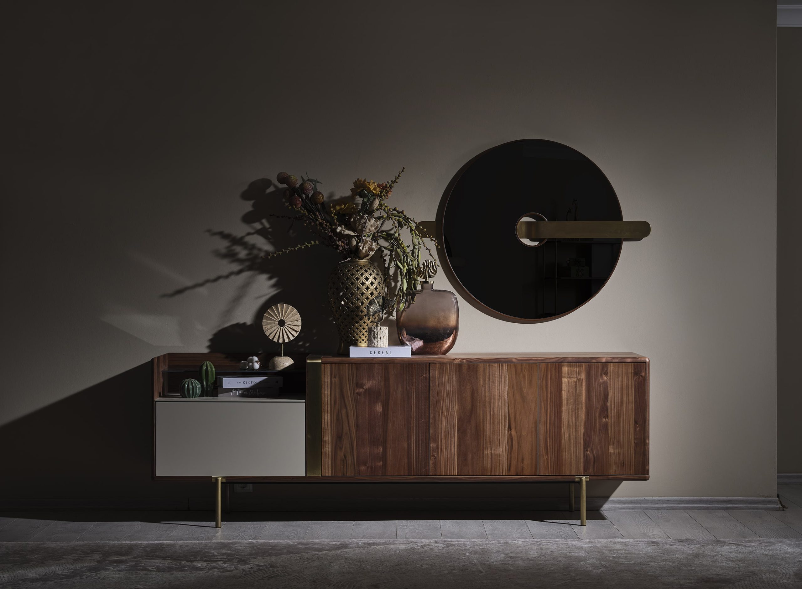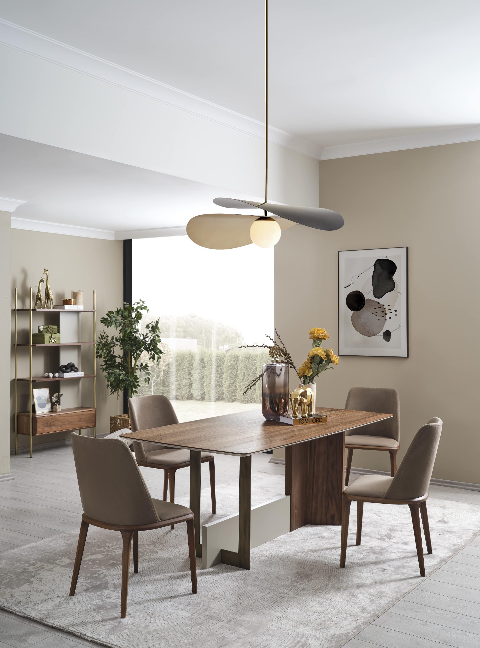 Dalvia Yemek Odası, zarif ceviz desenleri ve altın rengi detaylarıyla sıcaklık ve sofistikeliği bir arada sunuyor. Özgün ayak tasarımıyla öne çıkan masa, fonksiyonelliğin yanı sıra dekoratif bir değer de taşıyor. Konsol, raf ve ayna gibi tamamlayıcı parçalar, mekânda bütünlük yaratırken; sade çizgileriyle çağdaş iç mekanlara kusursuz bir uyum sağlıyor. Dalvia, sadece yemek yemek için değil, paylaşımın ve estetiğin buluştuğu bir atmosfer yaratmak için tasarlandı.