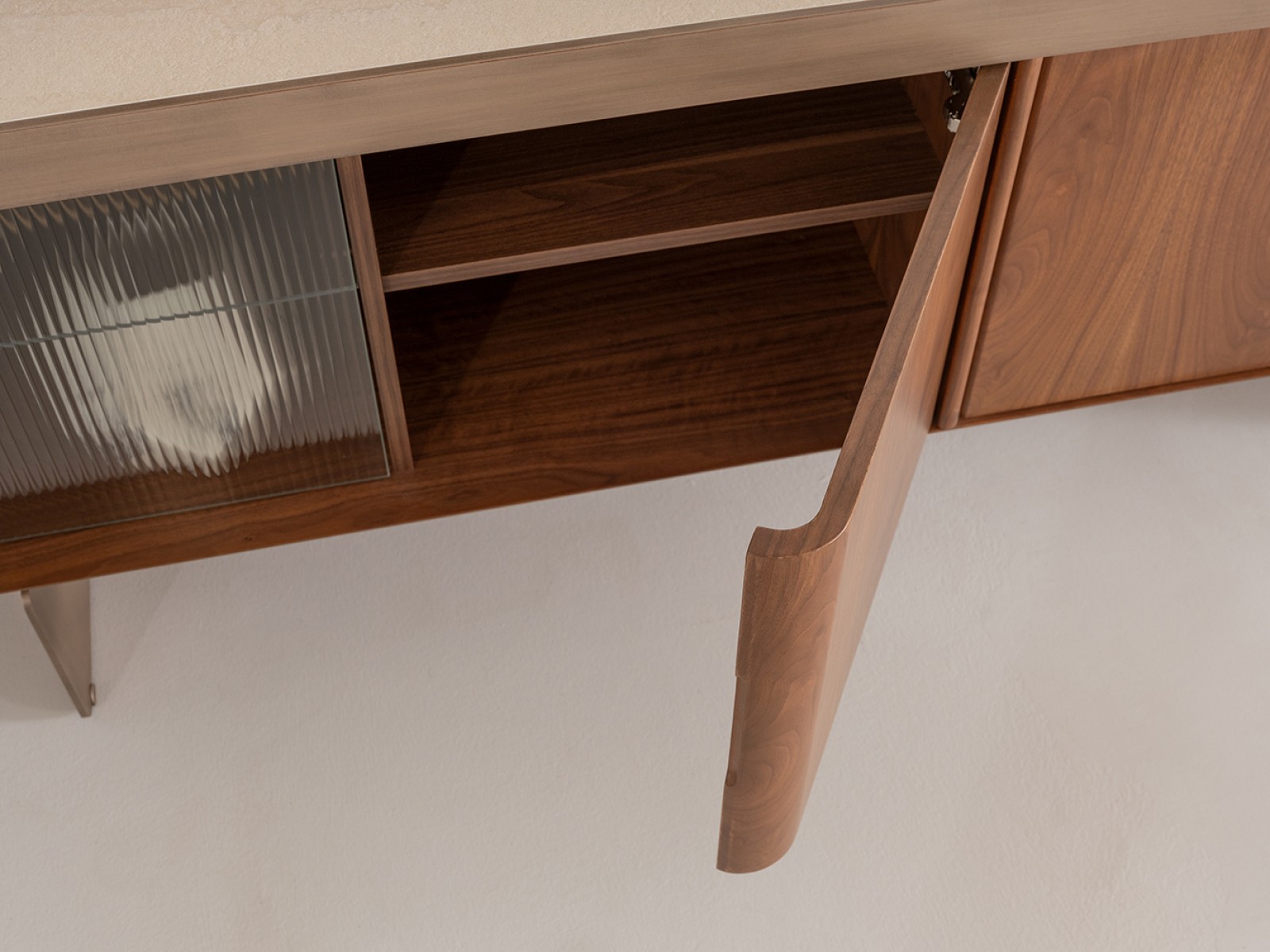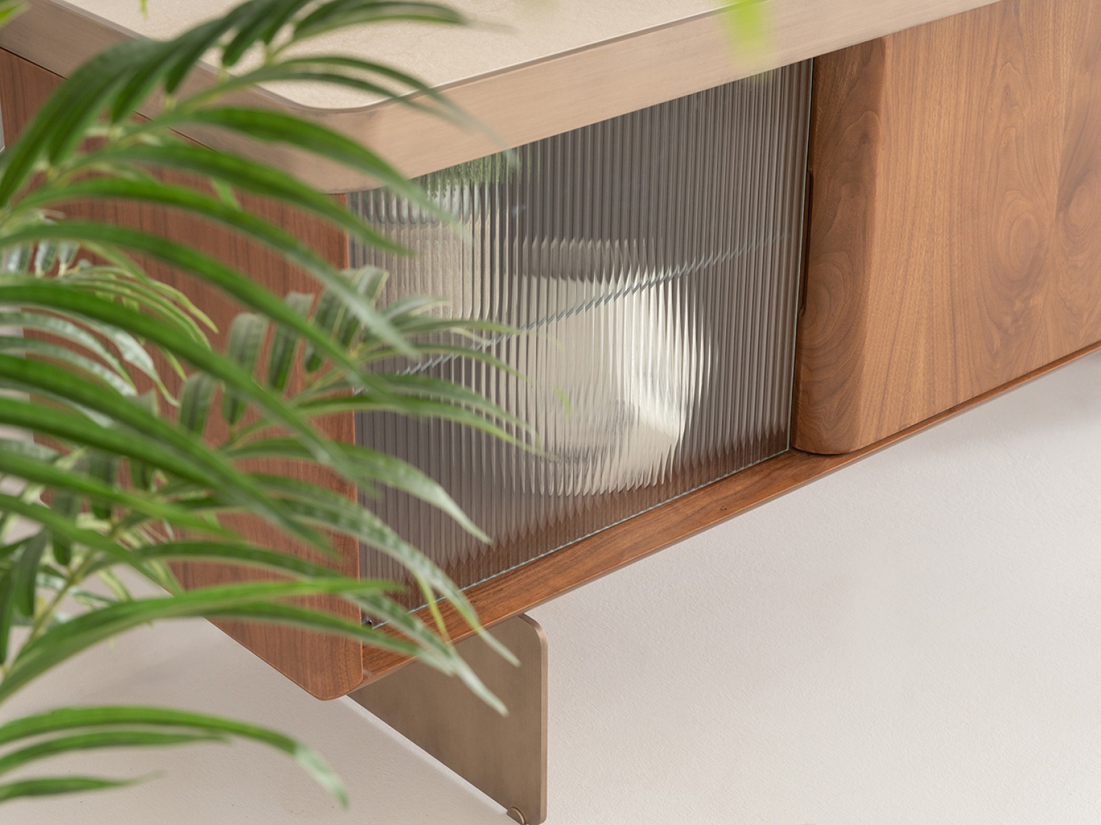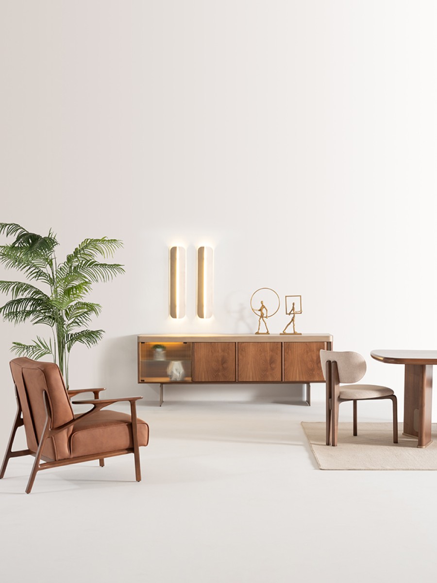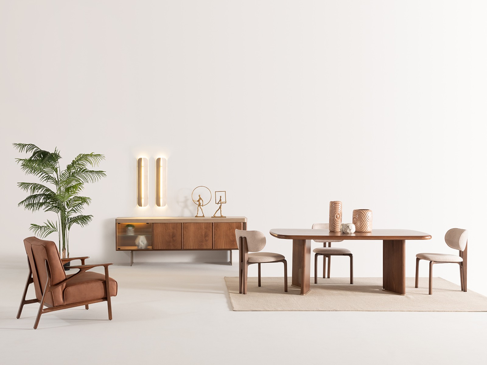 Evora Yemek Odası, yuvarlatılmış kenarlara sahip masa ve sandalyeleriyle hem görsel hem de fiziksel yumuşaklık hissi yaratıyor. Ceviz ağacının sıcak tonları ve cam detaylı konsol tasarımı, modern çizgilerle birleşerek zamansız bir estetik ortaya koyuyor. Minimalist duruşu güçlü malzeme diliyle dengeleyen Evora, sade ve şık sofralar kurmak isteyenler için zarif bir tercih sunuyor.