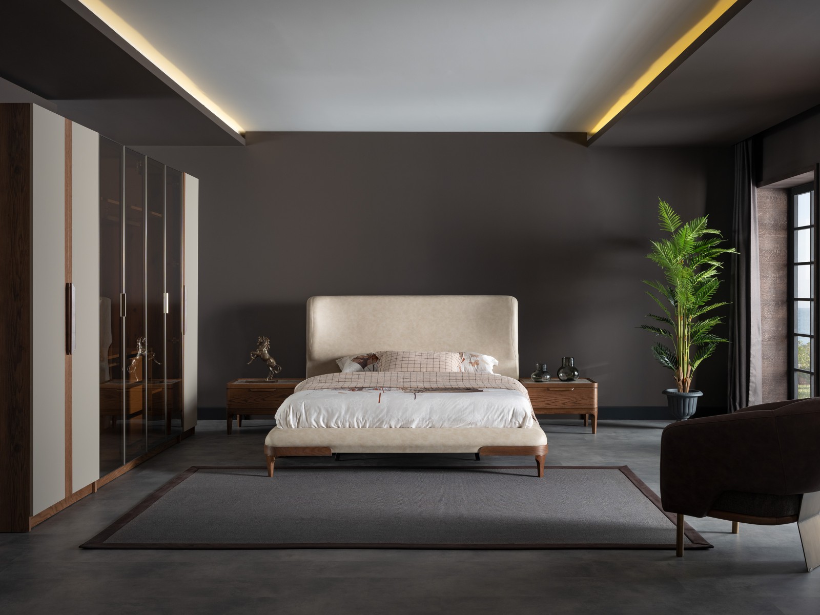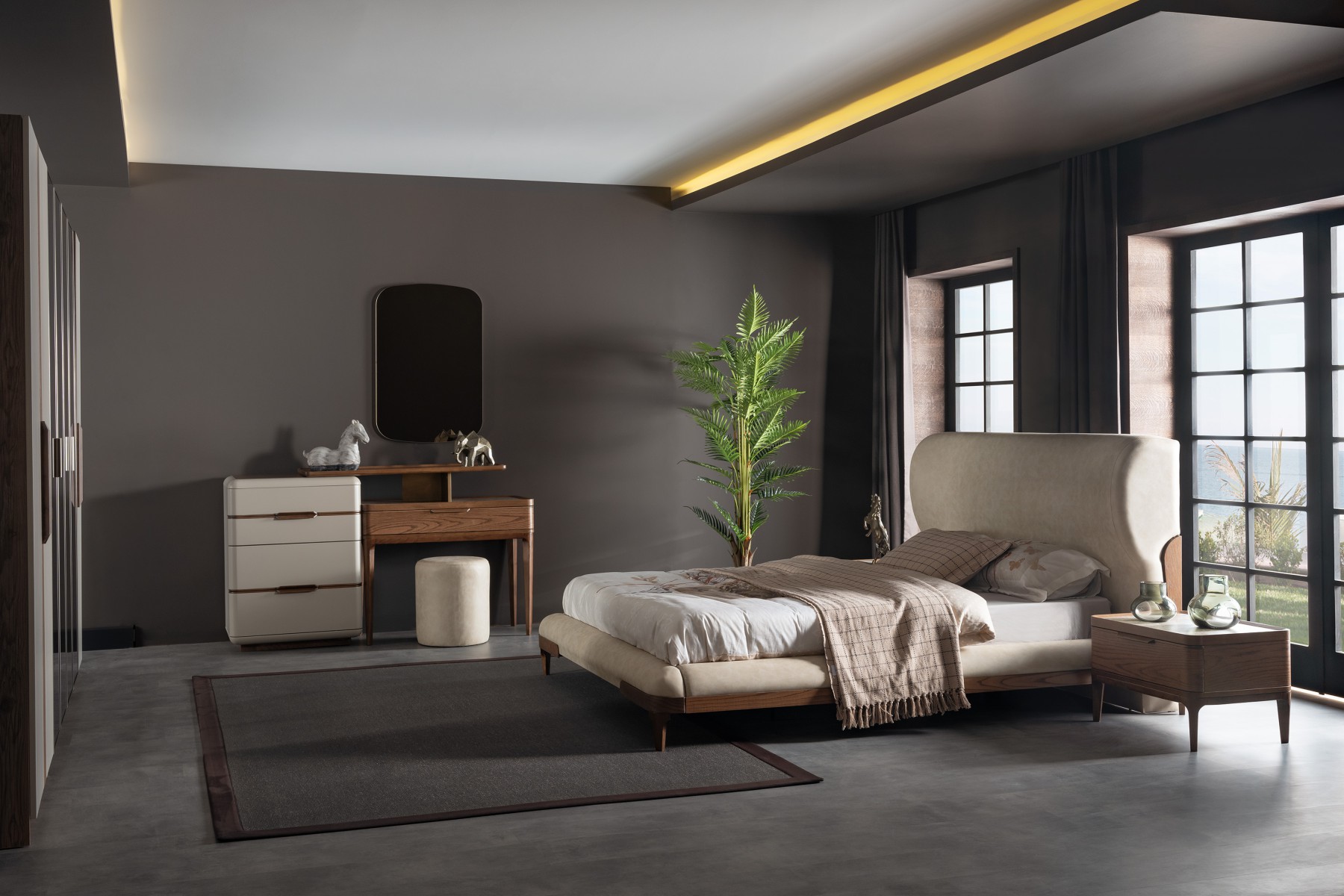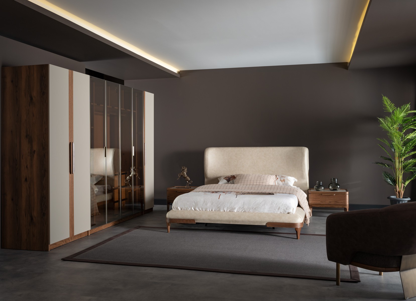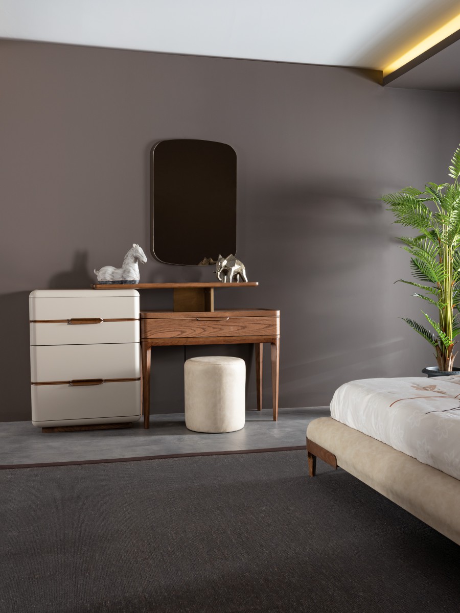 Lucia Yatak Odası, kıvrımlı hatlara sahip yumuşak başlığı ve ceviz tonlarının sıcaklığıyla dingin bir atmosfer yaratıyor. Mermer detaylar ve el işçiliğini yansıtan dokular, modern tasarımı zamansız bir zarafetle buluşturuyor.