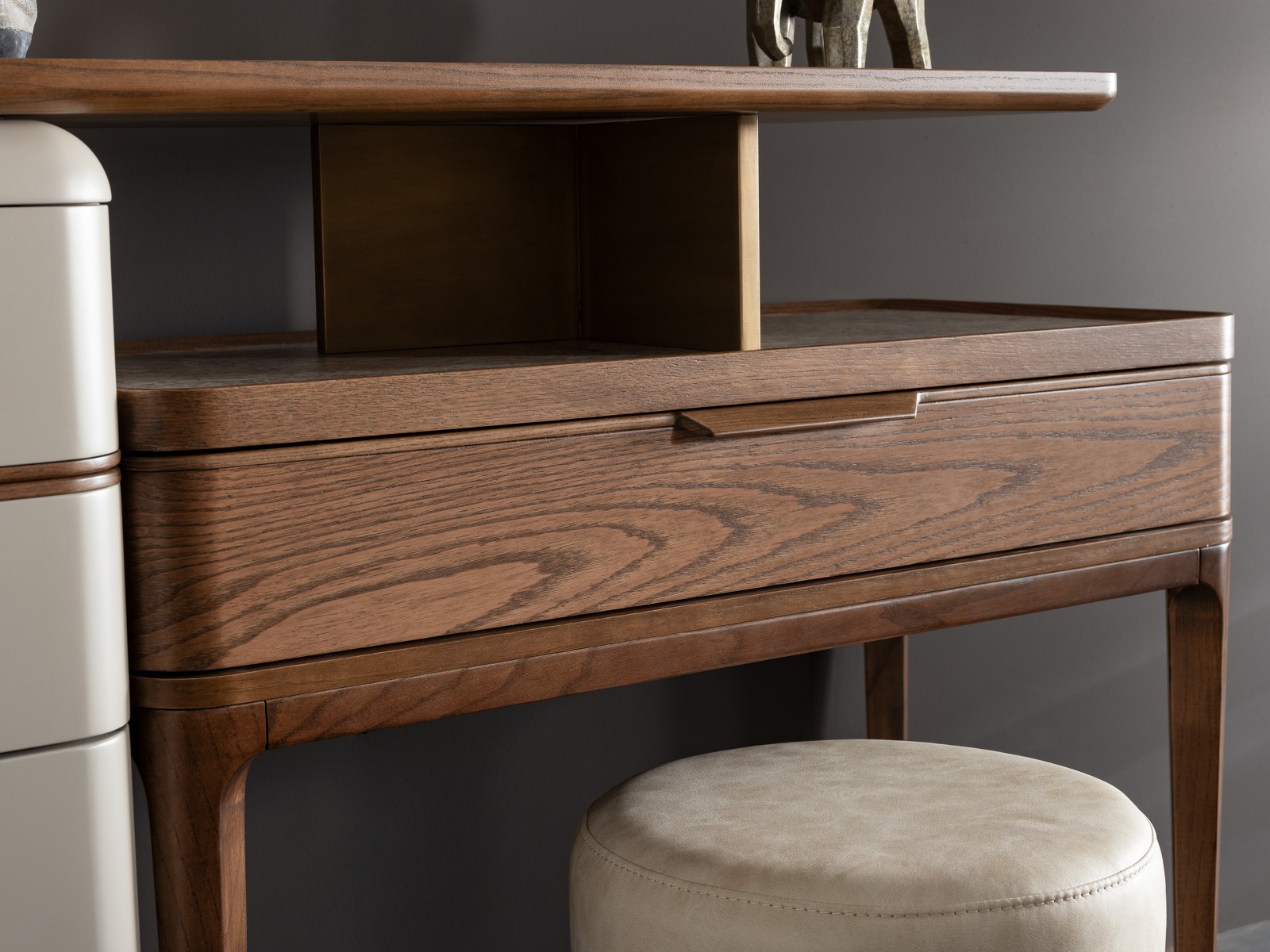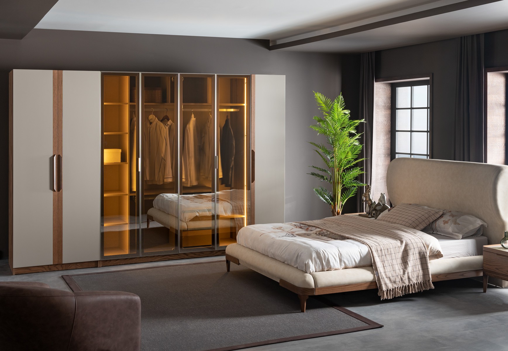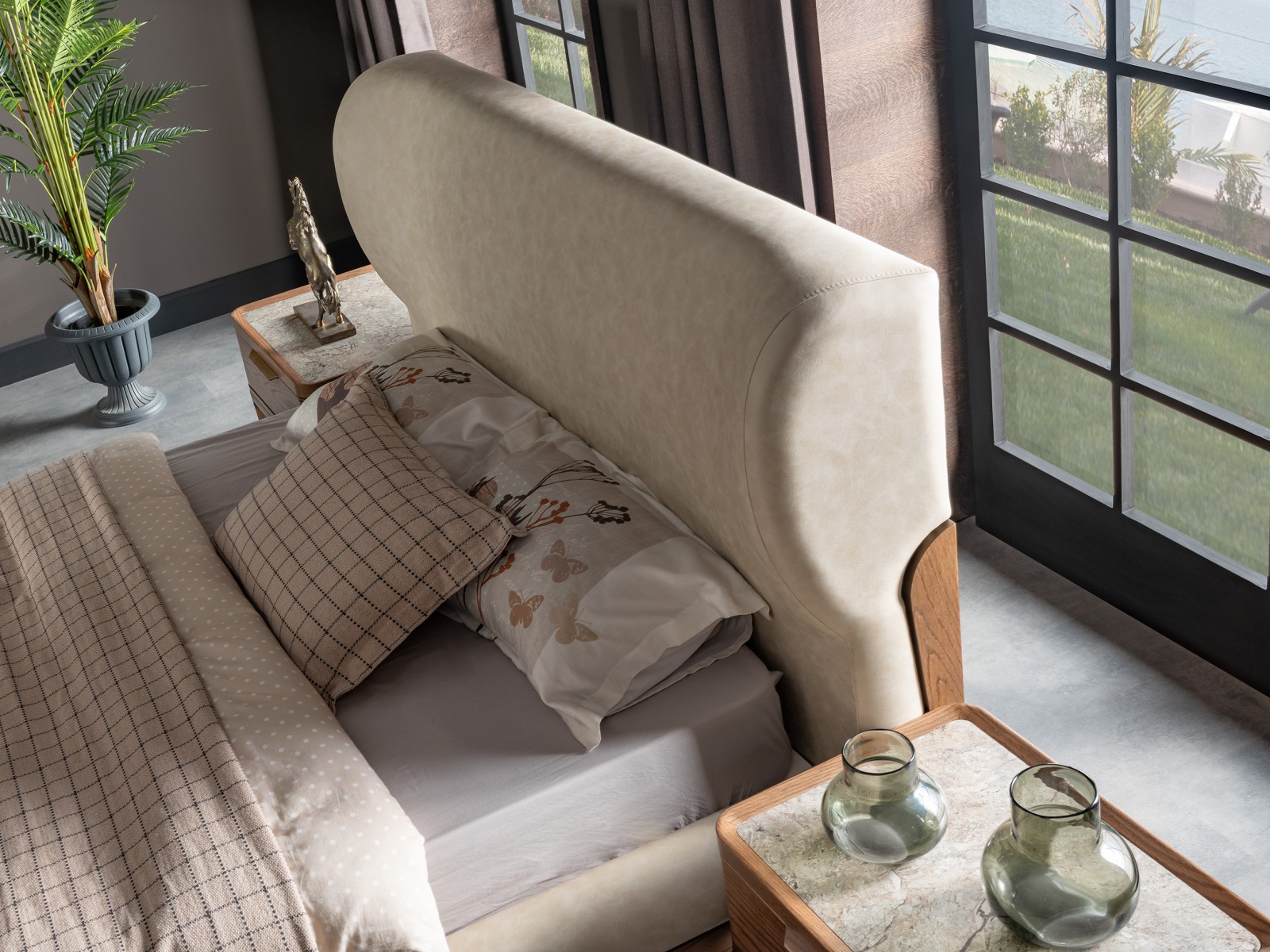 Lucia Yatak Odası, kıvrımlı hatlara sahip yumuşak başlığı ve ceviz tonlarının sıcaklığıyla dingin bir atmosfer yaratıyor. Mermer detaylar ve el işçiliğini yansıtan dokular, modern tasarımı zamansız bir zarafetle buluşturuyor.