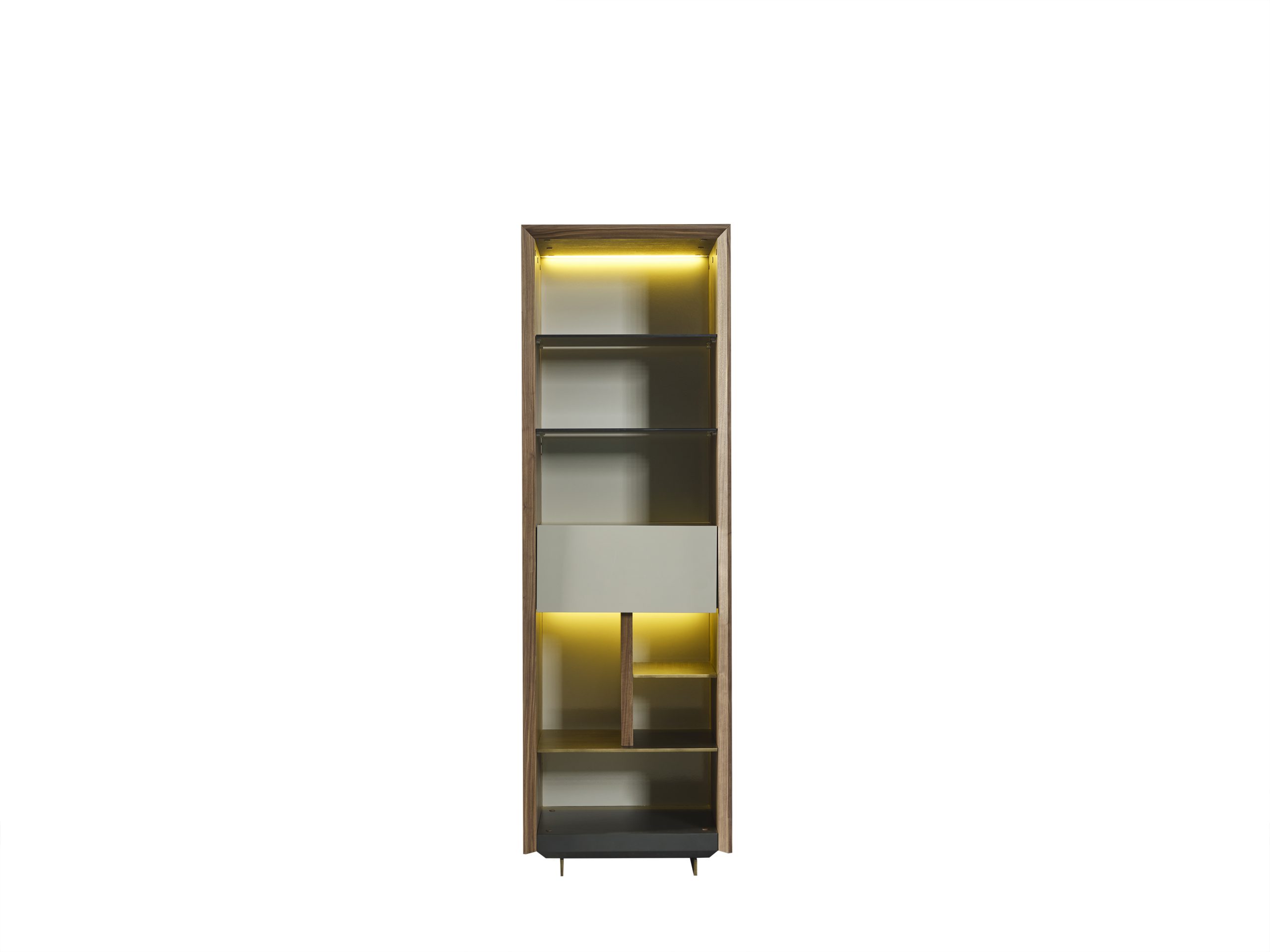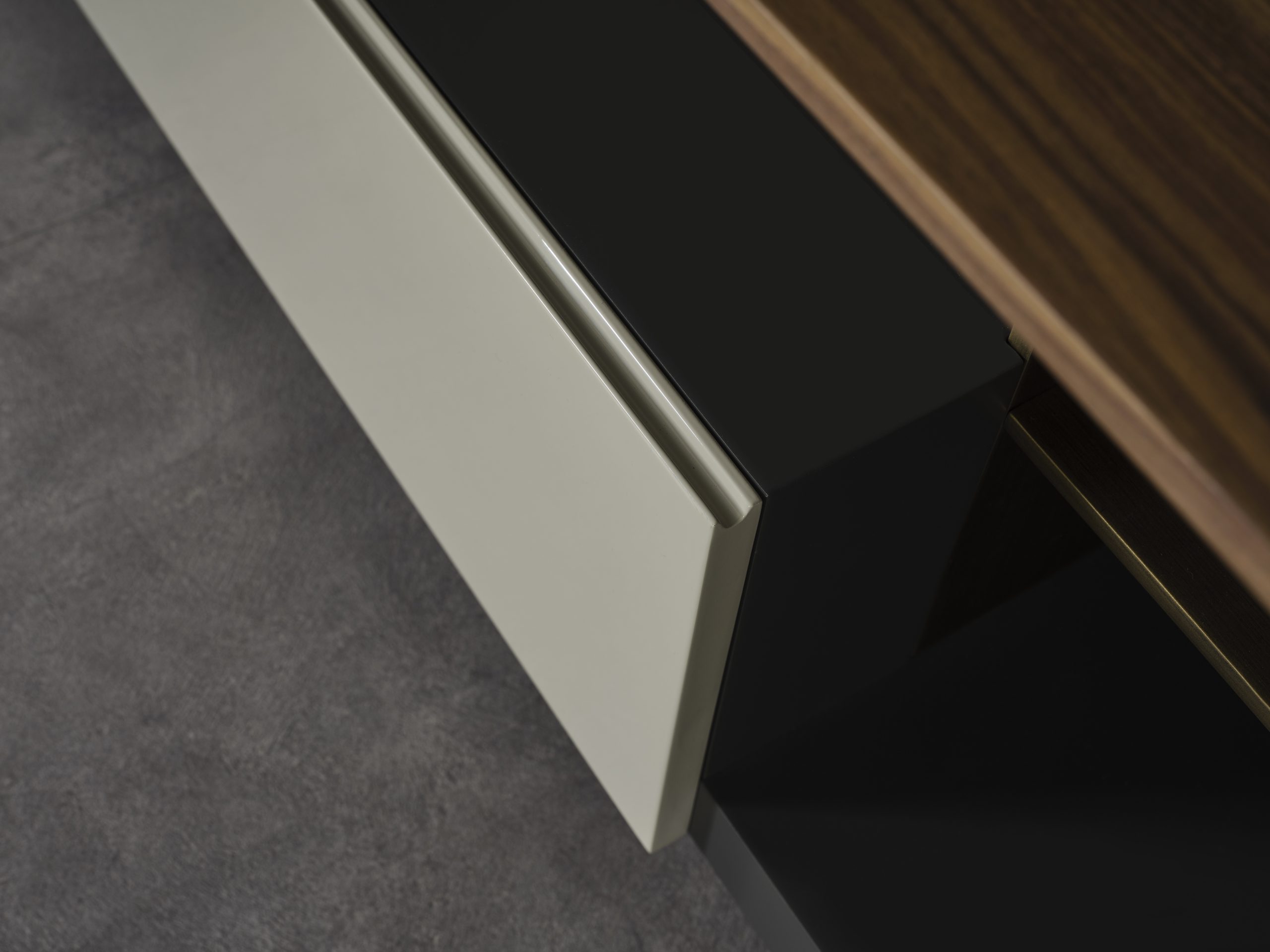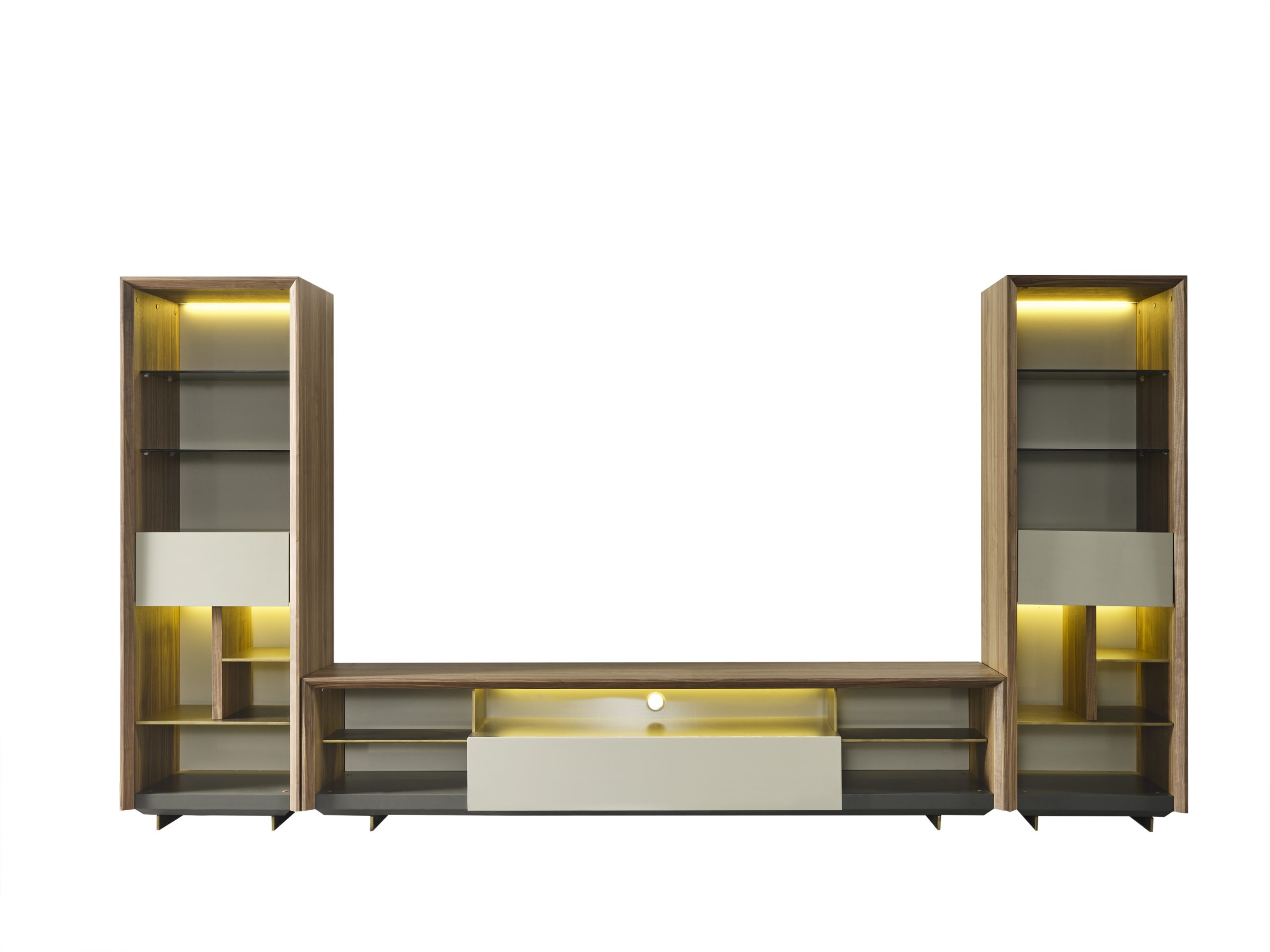 Parian TV Ünitesi, farklı dokuları bir araya getiren raf tasarımı, bronz dokunuşlar ve sıcak ceviz tonuyla çağdaş bir şıklık sunuyor. Fonksiyonel bölmeleri, LED aydınlatmaları ve dikkat çeken yüzey kontrastlarıyla oturma alanlarına hem estetik hem de pratik bir çözüm getiriyor.