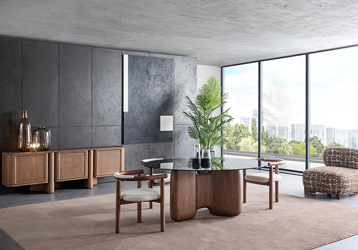 Vincent yemek odası, heykelsi formlar ve güçlü malzeme birleşimleriyle modern yaşam alanlarına karakter katıyor.